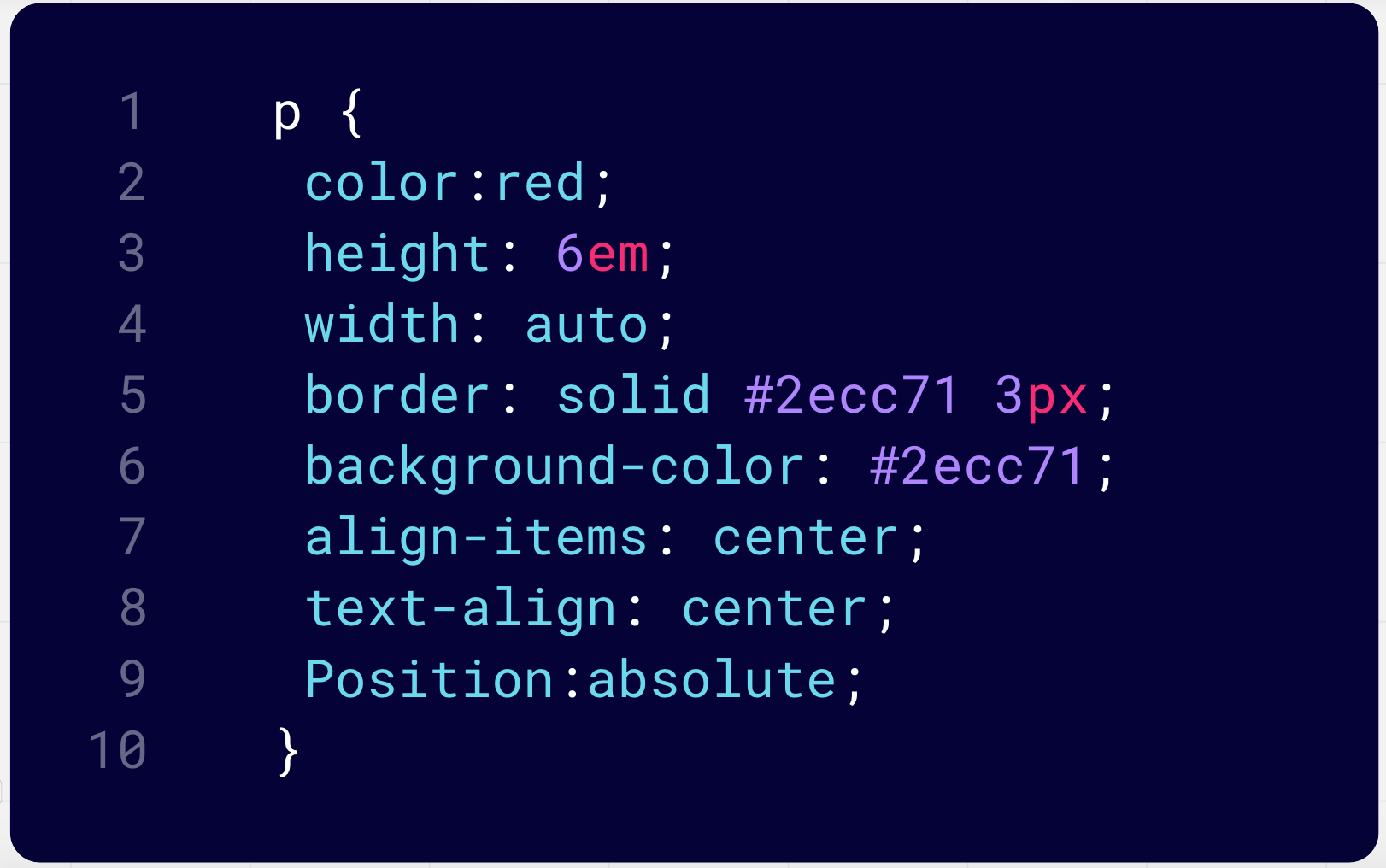 De la même façon que HTML, CSS n'est pas vraiment un langage de programmation. C'est un langage de feuille de style, c'est-à-dire qu'il permet d'appliquer des styles sur différents éléments sélectionnés dans un document HTML. Par exemple, on peut sélectionner tous les éléments d'une page HTML qui sont paragraphes et afficher leurs textes en rouge avec ce code CSS :